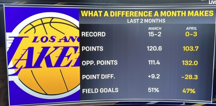 • 这种“魔鬼赛程”,让湖人即便在三月“超神”,也无法避免在四月“现原形”
